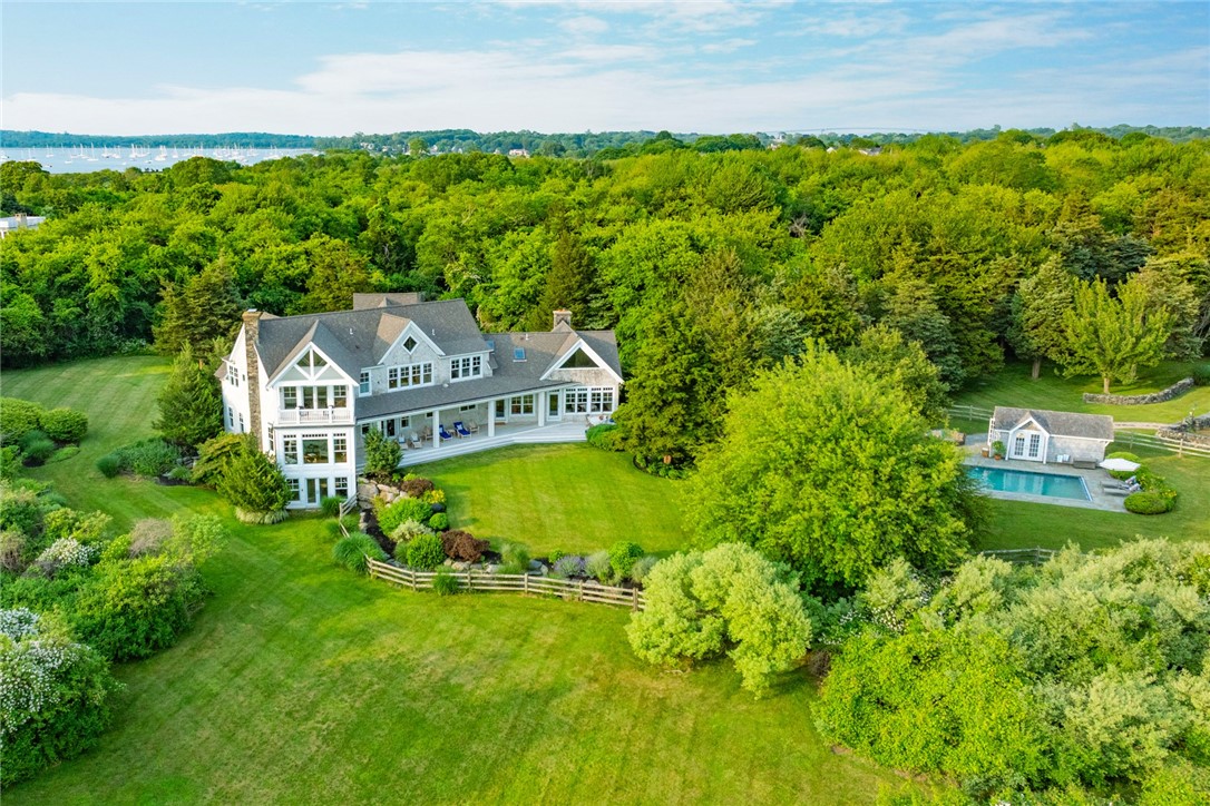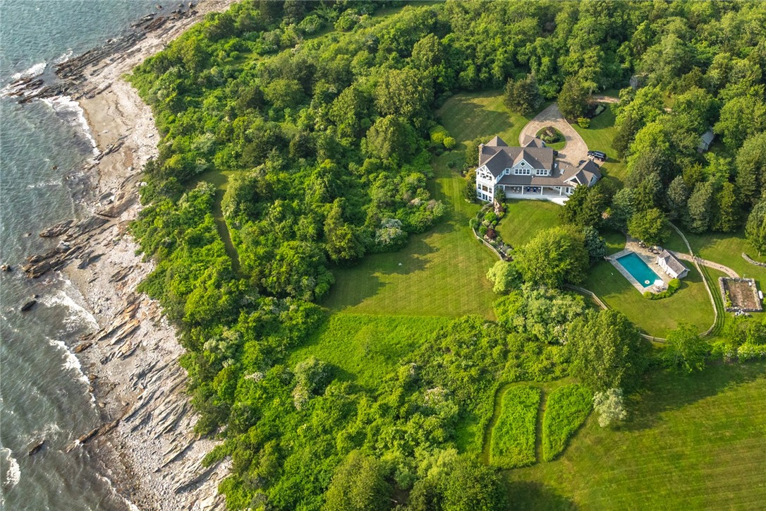 Introducing South Winds, a coastal landmark estate custom-designed and privately held by one family now offered for the first time in its history. Set on 14.4 acres of pastoral waterfront, this serene sanctuary offers a kaleidoscope of seasonal color where land meets sea. A peaceful retreat just a short walk to town, this architectural gem captures the essence of coastal New England living. With sweeping ocean vistas and the murmur of waves as your soundtrack, the home offers en-suite comfort in all four bedrooms. The primary suite features a private balcony with views to Rhode Island Sound and West Passage. Architectural millwork and built-ins enrich the thoughtful design. Entertain on the expansive covered deck, while taking in sunset views, just steps from the beach. Launch your paddleboard, swim, or fish from the shoreline, meander through cedar trees where you are amongst conservation land, wildlife and calming meadows. Unwind by the pool and cabana, or cultivate your garden within the artisan stone-walls and gate. Additional structures include a barn and versatile outbuildings ideal for a studio, workshop, or creative space. With town water and family compound potential, South Winds is a rare blend of tranquility and accessibility a coastal haven for family and friends to gather comfortably, and where memories are made.