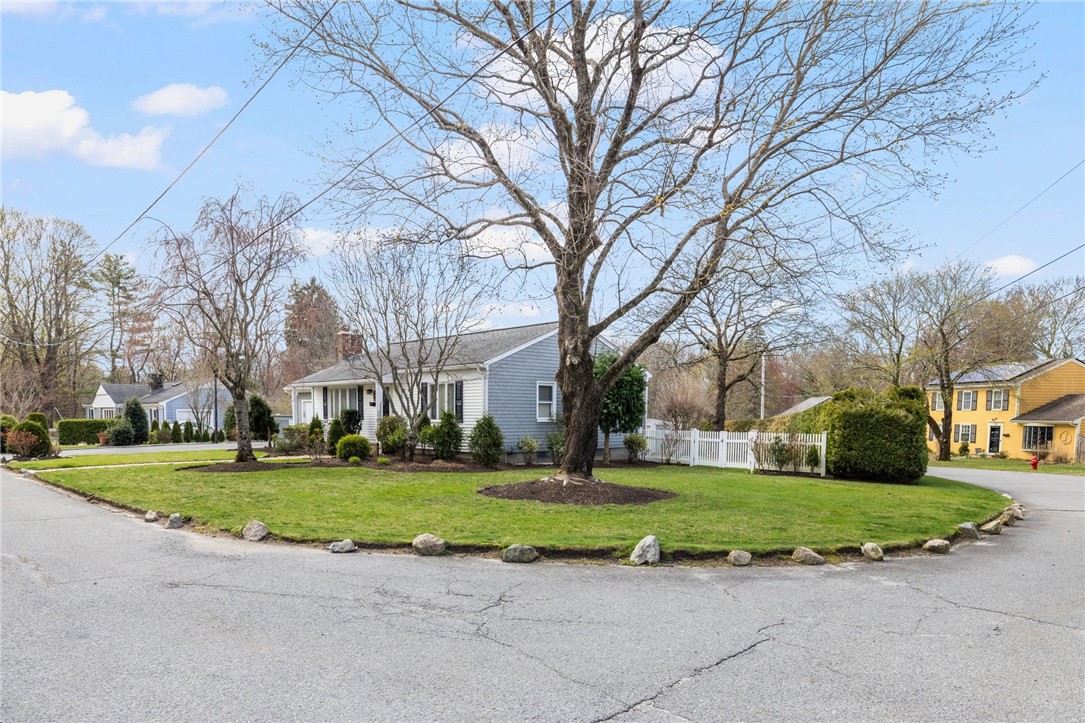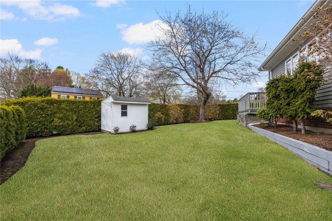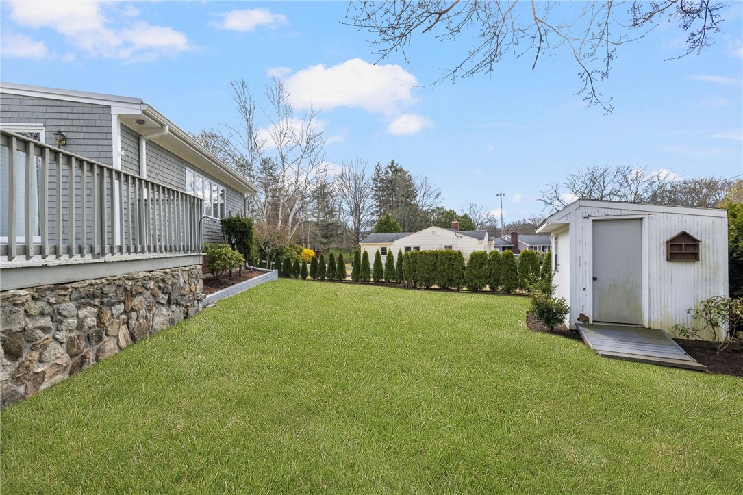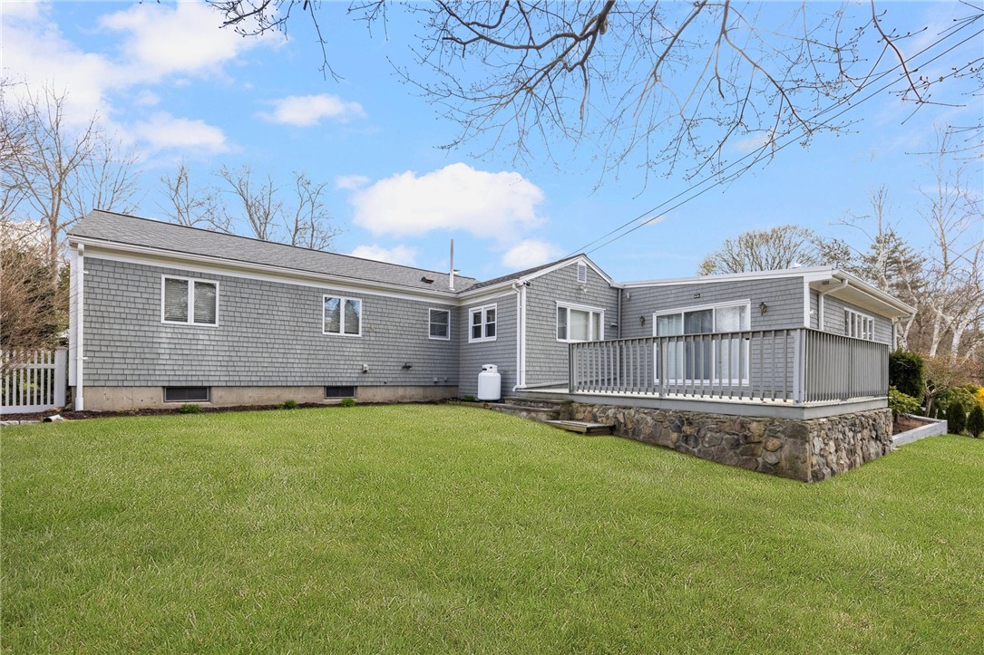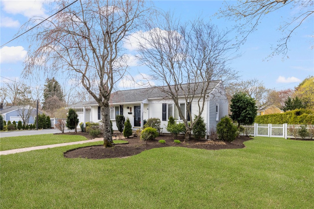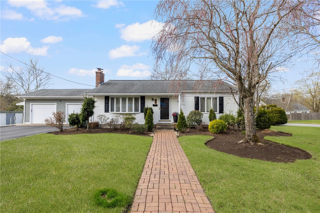 Enjoy the convenience of being just minutes from East Greenwich's Hill & Harbour district, where shops, restaurants, marinas, and coastal charm meet. This expanded ranch offers a comfortable layout with thoughtful updates throughout. A neatly maintained privacy hedge frames the property, complemented by a spacious deck and outbuilding. Inside, the living room features a wood-burning fireplace and freshly painted interiors and hardwood flooring. Picture-frame molding adds character in the hallway and dining area, which opens to an eat-in kitchen with a breakfast counter with seating on both sides. To the right of the home are three bedrooms and a full bath. A large family room off the back of the home offers a second fireplace and sliders to the deck for easy indoor-outdoor living. A secondary bath with shower and a large pantry closet add convenience and organized storage space. Additional highlights include a one-car garage and a lower level ready to be finished or customized by the next owner.